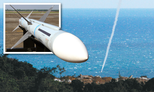 近年在實彈測考時,臺軍空軍陸射型麻雀導(dǎo)彈(小圖)不斷出現(xiàn)失靈墜海或離架失效的狀況。圖為去年導(dǎo)彈落海狀況。(來源:臺灣《聯(lián)合晚報》)
