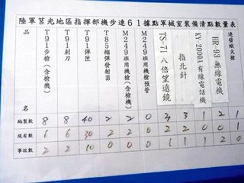 中國臺灣網(wǎng)1月15日消息 據(jù)臺灣今日新聞網(wǎng)報(bào)道,日前網(wǎng)上披露了一張臺灣馬祖陸軍莒光地區(qū)指揮部61據(jù)點(diǎn)的武器清點(diǎn)表,照片中據(jù)點(diǎn)單兵的武器配備數(shù)量、據(jù)點(diǎn)火力、妥善率全都有,被質(zhì)疑保密紀(jì)律松散。