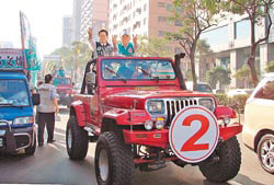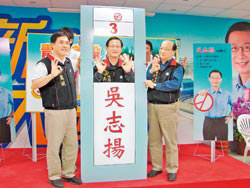選前最后周日,吳志揚(yáng)扮演“人體選票”,臺(tái)北市長(zhǎng)郝龍斌(左)、臺(tái)中市長(zhǎng)胡志強(qiáng)(右)幫他站臺(tái)。圖片來源:臺(tái)灣《中國(guó)時(shí)報(bào)》