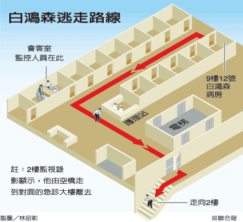據(jù)悉,前天中午白鴻森還和小女兒共進(jìn)午餐,但兩名警員卻未跟隨在旁,白鴻森趁警員平日松散、疏于戒備,直接從九樓病房走出來,三兩步踱越長(zhǎng)廊,走進(jìn)病房正對(duì)面的安全梯,拾級(jí)而下到二樓,再往門診大樓方向,宛如走自家后院般,一路暢行無阻,揚(yáng)長(zhǎng)而去。