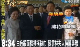 陳云林夫人賴(lài)曉華身著白色印花外套,再搭配上藍(lán)色絲巾,被贊俏麗典雅。 來(lái)源:臺(tái)灣中天電視臺(tái)