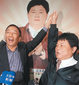 臺(tái)灣鴻海集團(tuán)董事長郭臺(tái)銘(左)昨天化身超級(jí)助選員,搭著他的私人專機(jī),到臺(tái)中為無黨籍民代顏清標(biāo)站臺(tái),舉起顏清標(biāo)的手高喊凍蒜,并表示這是第一次為候選人站臺(tái)。(圖片來源:臺(tái)灣《聯(lián)合報(bào)》)
