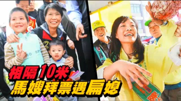中國(guó)臺(tái)灣網(wǎng)1月9日消息 據(jù)臺(tái)灣媒體報(bào)道,臺(tái)灣地區(qū)領(lǐng)導(dǎo)人馬英九夫人周美青昨日在高雄、臺(tái)中與苗栗拜票,昨日上午深入綠營(yíng)票倉高雄前鎮(zhèn)區(qū)永豐市場(chǎng)徒步掃街拜票,“恰巧”碰上前臺(tái)灣地區(qū)領(lǐng)導(dǎo)人陳水扁媳婦黃睿靚代丈夫、無黨籍民代候選人陳致中拜票,周美青與陳水扁兒媳分庭抗禮,黃睿靚不時(shí)將目光朝向周美青,但周被民眾團(tuán)團(tuán)圍住,兩人隔著一條約10米車道各自拜票,較勁意味濃厚。