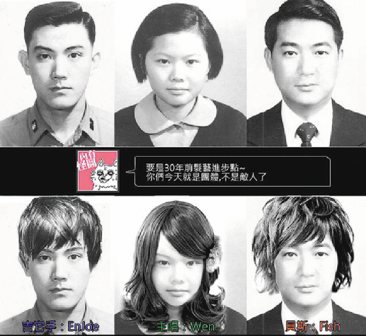 三位2012年臺灣地區(qū)領(lǐng)導(dǎo)人候選人年輕時期的照片,顯得靦腆、青澀,就有網(wǎng)友用修圖軟件kuso(惡搞)照片,幫三位候選人改變了新潮的發(fā)型,網(wǎng)友說,“要是30年前發(fā)藝(理發(fā)技術(shù))夠進(jìn)步,他們現(xiàn)在就不會是敵人,而是樂團(tuán)團(tuán)體!庇芯W(wǎng)友說,馬英九從年輕到現(xiàn)在都很帥,有人說他換上新發(fā)型之后,長得像彭于晏,有網(wǎng)友夸贊蔡英文換了發(fā)型之后,臉變小、也變漂亮了!