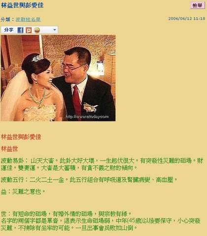 昵稱悲憨居士的網(wǎng)友在部落格中分析姓名,網(wǎng)頁出版時(shí)間為2006年6月12日,他以林益世和彭愛佳的名字進(jìn)行分析,寫到林益世屬“山天大畜”卦,此卦大好大壞,一生起伏很大。有突發(fā)性災(zāi)難的磁場,有貪不義之財(cái)?shù)膬A向。