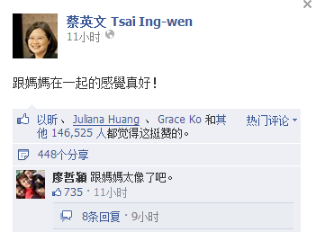 蔡英文臉書人氣依舊,母親節(jié)合照有14萬多名網(wǎng)友按贊關(guān)注。馬英九前天所刊出的《慈母良師一甲子,永世難報(bào)養(yǎng)育恩─悼亡母厚修女士》一文,也有近17萬網(wǎng)友按贊。(中國臺(tái)灣網(wǎng) 周劍)