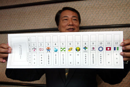 臺(tái)“中選會(huì)”去年12月21日公布有史以來首張彩色選票樣張,上面印有十二個(gè)參選不分區(qū)“立委”的政黨名稱及其政黨標(biāo)章。