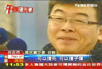 據(jù)臺(tái)灣TVBS電視臺(tái)報(bào)道,邱毅說(shuō)臺(tái)灣歌手潘美辰的歌曲《我可以為你擋死》是他最近的心情寫照:“可以擋死、可以擋子彈,心情不好,就聽聽潘美辰的這首歌,聊以自慰啊!”