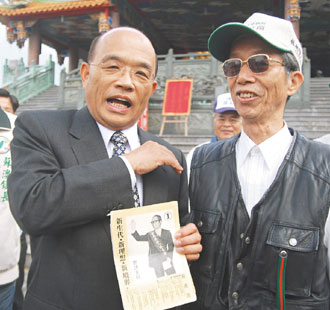 蘇貞昌(左)昨到宜蘭輔選,支持者林阿山拿出30年前的老文宣,向他要簽名。來源:臺灣《聯(lián)合報(bào)》