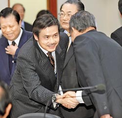 新任國(guó)民黨秘書長(zhǎng)金溥聰16日進(jìn)入中常會(huì)會(huì)場(chǎng)時(shí),與在場(chǎng)的中常委一一握手致意。 來源:臺(tái)灣《中國(guó)時(shí)報(bào)》