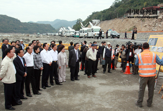 12月24日上午,海協(xié)會會長陳云林一行在臺灣;鶗麻L江丙坤陪同下到南投水里新山村壽山橋“莫拉克”風(fēng)災(zāi)災(zāi)區(qū)進行參訪。(中國臺灣網(wǎng) 李徽 攝)