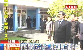 蔣經(jīng)國逝世22周年,頭寮陵寢一大早就有不少民眾前往鞠躬獻花,馬英九上午10時30分,率領(lǐng)國民黨中央黨部秘書長金溥聰?shù)赛h務(wù)主管前往謁靈。