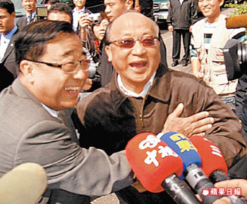 胡志強(右)與廖了以(左)都是大臺中市長熱門人選,兩人昨擁抱化解心結傳言。來源:臺灣《蘋果日報》