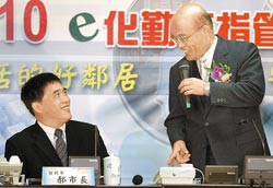 2007年蘇貞昌參加活動(dòng),致詞時(shí)與身旁的郝龍斌互動(dòng)。(圖:臺(tái)灣《中國(guó)時(shí)報(bào)》)