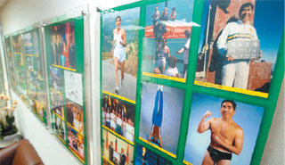 如果來(lái)到蔡同榮研究室,一定不會(huì)搞混,因?yàn)橐淮蜷_(kāi)房間門,就是蔡同榮兩大巨幅人頭照,再往前望去,一整排的個(gè)人記錄照片更是精采,不但有他與夫人結(jié)婚的照片、女兒結(jié)婚時(shí)與父親共舞的照片、最經(jīng)典的當(dāng)然就是蔡同榮最引以為傲的裸上半身之胸肌玉照,張張精采,簡(jiǎn)直就是用照片寫出一部自傳。