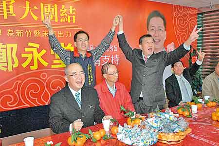 國(guó)民黨榮譽(yù)主席吳伯雄(前排左一),23日到新竹縣“立委”補(bǔ)選候選人鄭永堂(后排左)競(jìng)選服務(wù)處固票?h長(zhǎng)邱鏡淳(前排右二)拉起鄭永堂的手,并比出“2號(hào)”手勢(shì)。圖片來(lái)源:臺(tái)灣《中國(guó)時(shí)報(bào)》
