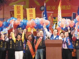 國民黨主席馬英九(右三)昨晚到竹東鎮(zhèn),他拉起國民黨候選人鄭永堂的手,拜托鄉(xiāng)親支持。 來源:臺灣《聯(lián)合報》
