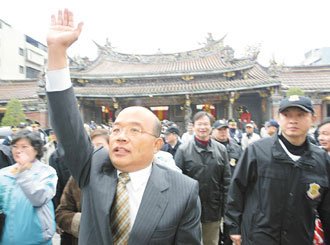 蘇貞昌和保安宮結(jié)緣深,2008年“大選”時,身為臺灣地區(qū)副領(lǐng)導(dǎo)人參選人,曾到保安宮祈福。今天將在此宣布參選臺北市長,在神明前許諾,不是選假的。圖片來源:臺灣《聯(lián)合報》