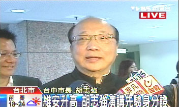 臺(tái)中市長(zhǎng)胡志強(qiáng)今天到臺(tái)灣政治大學(xué)進(jìn)行一場(chǎng)演講,會(huì)場(chǎng)門口的負(fù)責(zé)人要求進(jìn)場(chǎng)學(xué)生刷學(xué)生證及簽到,確定學(xué)生的身份,避免又有意外發(fā)生。不過主辦的老師則說,簽到只是要確定出席率而已,無關(guān)維安,胡志強(qiáng)也說,并不擔(dān)心被嗆聲。