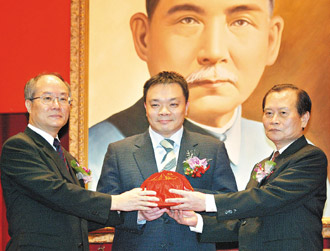 臺當(dāng)局“法務(wù)部”上午舉行“部長”交接典禮,監(jiān)視人臺當(dāng)局“行政院政務(wù)委員”高思博(中)從“代理部長”黃世銘(左)手中接過印信,并轉(zhuǎn)交給新任“部長”曾勇夫(右)。圖片來源:臺灣《聯(lián)合晚報》