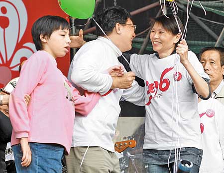 天使心家族社會福利基金會舉辦“三三六愛奇兒日”嘉年華游行,馬英九夫人周美青(右)與愛奇兒一起同樂,并與臺上的身障兒家庭擁抱。圖片來源:臺灣《中國時報》