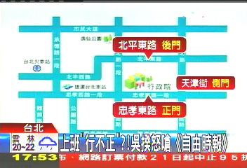 據(jù)悉,臺灣“行政院”共有有五個門,分別為右前門、左前門,兩邊側(cè)門以及后門。親綠的《自由時報(bào)》的報(bào)道稱,吳敦義上班時不敢走大門,都是從側(cè)門入院,是個“行不正的院長”。