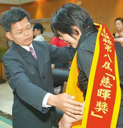 拼初選,也拼政績,高雄縣長楊秋興4日頒獎表揚高雄縣第八屆“慈暉獎”14位獲獎的愛心媽媽。圖片來源:臺灣《中國時報》