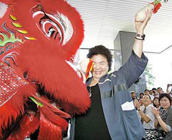 高雄市政府4日舉行水陸觀光車鴨子船掛牌儀式,舞獅送上好彩頭給陳菊。圖片來源:臺灣《中國時報》