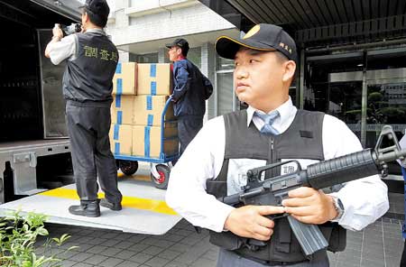 臺當局“法務(wù)部調(diào)查局”5日進行年度銷毀毒品作業(yè),在“調(diào)查局”人員荷槍實彈保護下,將一箱箱毒品裝上借自臺灣銀行的運鈔車,前往木柵焚化爐進行銷毀。圖片來源:臺灣《中國時報》