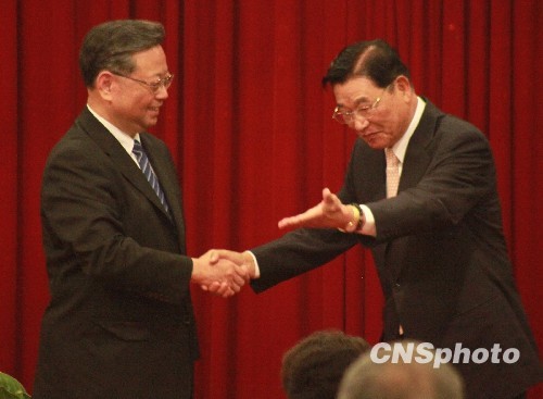 5月5日,臺灣;鶗麻L江丙坤在臺北圓山大飯店舉行午宴,歡迎福建省長黃小晶率福建省經(jīng)貿(mào)文化交流團來臺訪問。兩位老朋友相見甚歡,期待透過此次訪問進一步推動兩地全方位交流合作。 中新社發(fā) 羅欽文 攝