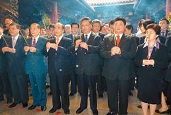 福建省長黃小晶(右三)與臺“立法院長”王金平(左三)、鎮(zhèn)瀾宮董事長顏清標(右二),向鎮(zhèn)瀾宮媽祖上香祝壽。圖片來源:臺灣《中國時報》