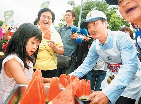 左撇子的金溥聰拿起西瓜刀,俐落地切開一個大西瓜。 來源:臺灣《中國時報》