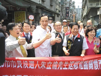 臺(tái)當(dāng)局前“行政院副院長(zhǎng)”朱立倫(前排左二)投入新北市長(zhǎng)選舉,昨天到中和市與鄉(xiāng)親博感情,受到當(dāng)?shù)孛癖姛崃覛g迎。圖片來(lái)源:臺(tái)灣《聯(lián)合報(bào)》