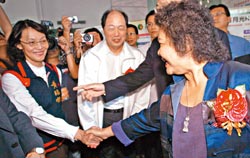大高雄市長參選人國民黨黃昭順(左)與民進黨陳菊(右),26日一同出席日月光集團高雄廠K12新建大樓動土典禮,兩人見面時禮貌性握手、互動不多。圖片來源:臺灣《中國時報》