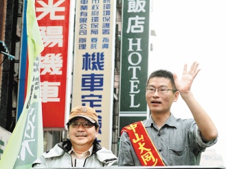 前民進黨秘書長吳乃仁29日上午陪同臺北市議員參選人梁文杰(右)拜票。(圖片來源:臺灣《聯(lián)合晚報》)