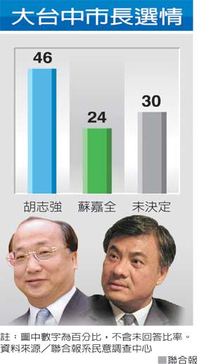 臺(tái)中市四名官警出現(xiàn)在黑道角頭被槍擊死亡現(xiàn)場(chǎng),引發(fā)社會(huì)嘩然,對(duì)年底大臺(tái)中市長(zhǎng)選情的沖擊備受關(guān)注。選情調(diào)查發(fā)現(xiàn),國(guó)民黨提名的胡志強(qiáng)聲勢(shì)仍居上風(fēng),目前獲得46%選民支持,民進(jìn)黨蘇嘉全支持率24%,30%未決定。