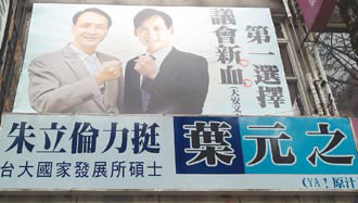 市議員參選人葉元之與朱立倫合照,卻因?yàn)橹炝惐惶崦麨閲?guó)民黨副主席,已屬違規(guī),恐遭要求撤下。 圖片來(lái)源:臺(tái)灣《聯(lián)合報(bào)》