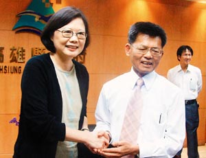 民進(jìn)黨主席蔡英文7日傍晚探視高雄縣長(zhǎng)楊秋興。 圖片來(lái)源:臺(tái)灣《聯(lián)合報(bào)》