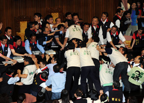 臺(tái)灣“立法院”臨時(shí)會(huì)8日審議ECFA(兩岸經(jīng)濟(jì)合作框架協(xié)議),由于民進(jìn)黨暴力阻撓表決,現(xiàn)場(chǎng)爆發(fā)肢體沖突,多名“立委”掛彩,混亂中通過(guò)將ECFA等案徑付二讀。