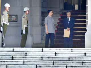 臺“司法院長”賴英照請辭獲準,“司法院副院長”謝在全(右1)18日下午獲馬英九召見,在短暫會晤后,謝在全離開馬英九辦公室。 圖片來源:“中央社”