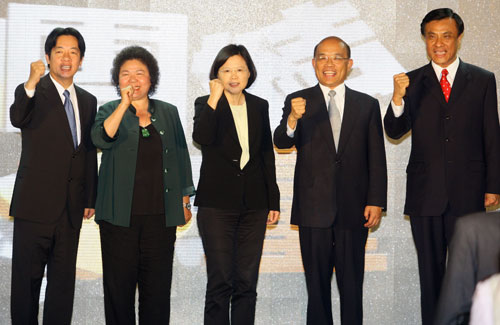 民進(jìn)黨年底“五都”市長(zhǎng)參選人蘇嘉全(右起)、蘇貞昌、蔡英文、陳菊與賴清德,5月25日一同出席造勢(shì)大會(huì)。(“中央社”圖)