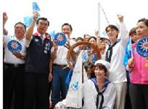 黃昭順今天在高雄港“香蕉碼頭”舉行造勢(shì)活動(dòng),和女兒陳菁徽一起穿上水手服,在金溥聰?shù)呐阃碌巧稀绊槨弊痔?hào)帆船啟航出港,宣誓未來(lái)將帶領(lǐng)高雄經(jīng)濟(jì)起飛。