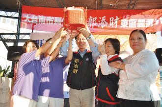 國(guó)民黨大臺(tái)南市長(zhǎng)候選人郭添財(cái)(中)10日成立東區(qū)競(jìng)選分部,支持者送上包子,祝他包中。圖片來(lái)源:臺(tái)灣《聯(lián)合報(bào)》