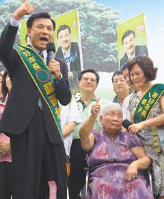 蘇嘉全推著坐輪椅的岳母上臺,向現(xiàn)任市長胡志強(qiáng)下戰(zhàn)帖,要求公開辯論。來源:臺灣《聯(lián)合報(bào)》