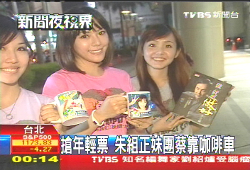 據(jù)報(bào)道,朱立倫于昨日晚間成立了“正妹助選團(tuán)”,共5名美女成員,其中有一位還曾與鐘漢良拍過(guò)戲。5名美女身穿印有朱立倫頭像的T恤,忙碌地派發(fā)文宣,推銷商品,幫忙募款,還要與前來(lái)合影的臺(tái)灣年輕民眾合影,“正妹團(tuán)”的一名成員“米果”表示實(shí)在是太過(guò)忙碌,不過(guò)感覺“很值得”,算是經(jīng)驗(yàn)和學(xué)習(xí)。