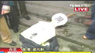 寫(xiě)著“周X春”的人型立牌遭到無(wú)情“蛋洗” 圖片來(lái)源:臺(tái)灣TVBS電視臺(tái)