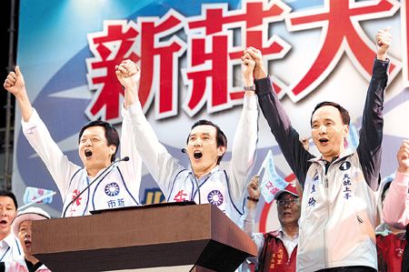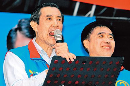 馬英九14日晚間出席國民黨新北市長候選人朱立倫(右)在新莊的造勢晚會,肯定臺北縣長周錫瑋(左)4年的政績,訴求選民讓國民黨繼續(xù)執(zhí)政。 來源:臺灣《中國時報》