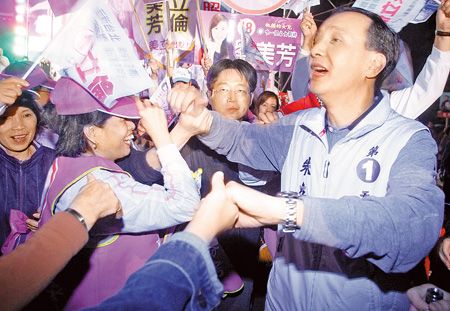 國(guó)民黨新北市候選人朱立倫15日晚在板橋舉辦造勢(shì)晚會(huì),進(jìn)場(chǎng)時(shí)受到支持群眾熱情包圍,朱立倫邊走邊與民眾握手致意。 (來(lái)源:臺(tái)灣《中國(guó)時(shí)報(bào)》)
