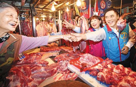 國民黨臺北市長候選人郝龍斌(右)一早前往市場拜票,與攤商搏感情。 來源:臺灣《中國時報》