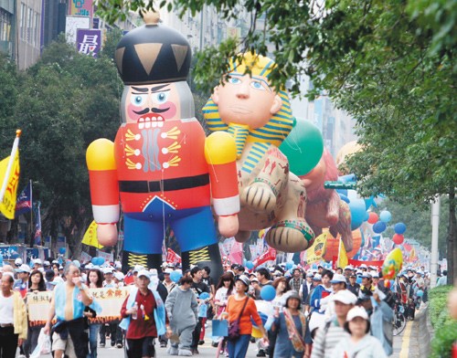國(guó)民黨21日舉行“為臺(tái)北而走”大游行,打著嘉年華訴求,隊(duì)伍中出現(xiàn)不少可愛(ài)的玩偶大氣球。 圖片來(lái)源:臺(tái)灣《聯(lián)合報(bào)》